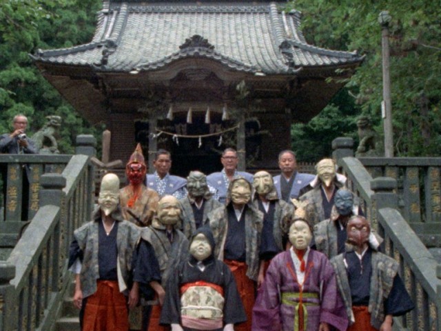 面掛行列は鎌倉の御霊神社で行われる祭礼。奈良時代から伝わる伎楽の面や田楽の面をつけた10人衆が御霊神社から極楽寺の坂までを練り歩き、豊作・豊漁を祈願する。野田は1972年に神奈川ニュース映画協会の依頼で祭礼を撮影し、後にフィルムをもらい受けて私家版として本作を完成させた。前半は面掛行列をダイナミックに映し、後半は展示のように面を紹介するという、動と静を対比させた構成が実験的な記録映画。