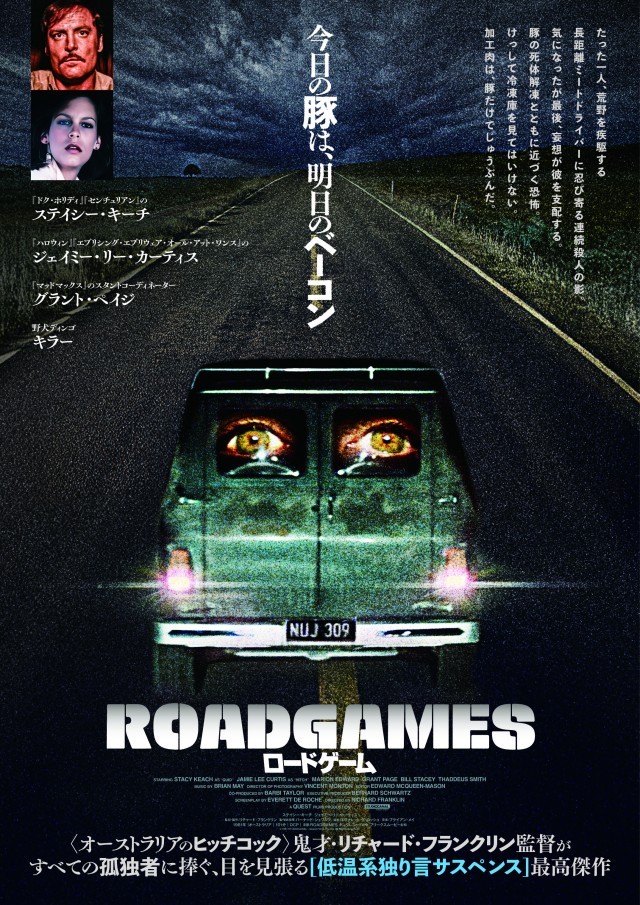 予告冒頭の、のどかな音楽はどこかに消え、次第に様子がおかしくなっていき、なぜかピンク色の光がステイシー・キーチの両目にぴったりドッキングするシーン含め、サスペンス、ロードムービー、独自のユーモア感覚など、ヒッチコックにも勝るとも劣らないかもしれないという『ロードゲーム』の魅力を予感させる。そして夜のアスファルトシーンに<すべての孤独者に捧ぐ低温系独り言サスペンス>とキャッチコピーが載る場面の音楽はまさに『マッドマックス』だが、音楽を担当しているのは『マッドマックス』『マッドマックス2』のブライアン・メイだった。