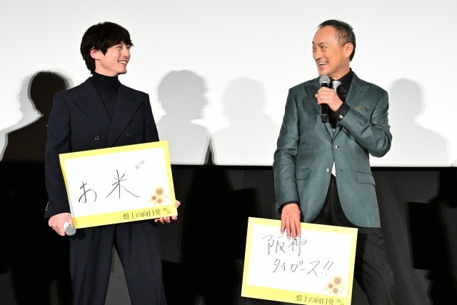 物語の鍵を握る桂介の元婚約者・宮田奈津子役の土屋は、坂口とは初共演。坂口について「スタッフさんとよくお話をされているイメージで、カメラマンさんにボケてツッコまれたり。撮影中は向日葵がこうなるくらい(下を向きながら)暑かったのに、健太郎さんは元気にコミュニケーションを取られていました。座長さんが元気でいてくださるのはとても助かりました」とニコリ。桂介の小学生時代に将棋を教えた恩人・唐沢光一朗役の小日向は「最近は日本映画が活気づいている中で、素敵な作品に参加出来て嬉しいです」と満足そうだった。桂介の父親・上条庸一を演じた音尾は、坂口との灼熱のガチンコ場面に触れて「真夏の炎天下の中でぶつかり合いましたが、坂口君は普段から優しい方で。大変なシーンなのに合間に僕の事を気遣ってくれて…大好きになりました!」とすっかりゾッコン。この馬乗りになって音尾の首を絞める当該シーンに坂口が「あまりにも暑すぎて汗がダクダク音尾さんにかかってしまって。でも両手がふさがっているので汗も拭けないし、芝居としてやりづらいだろうなと思った」と反省の弁になると、音尾は「いやいや。ここでしっかり言っておきたいのは坂口君の汗は…しょっぱいです!それだけはお伝えしたい!」と謎報告。まさかの“暴露”に坂口が「それはそうでしょう!?」と爆笑する横で、渡辺は「そのシーンを観て笑われたらどうするんだ!?良いシーンなんだからあ」と笑いながら呆れかえっていた。