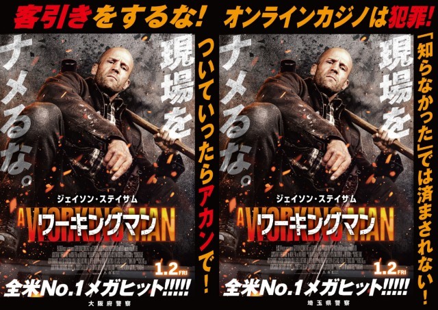 ジェイソン・ステイサム主演最新作 『ワーキングマン』 と”日本の治安“を守る警察とのタイアップが実現!警視庁、神奈川県警、埼玉県警、そして大阪府警と協力し、制作した犯罪撲滅ポスターが 12 月より順次掲出される。ポスター中央には、ステイサムが悪党に向けて睨みをきかす本作のキービジュアルが配置され、その周囲には、劇中でステイサム演じる主人公が対峙する犯罪「人身売買」をはじめ、銃器所持、オンラインカジノ、客引きなど、日本社会を脅かす犯罪に対して撲滅を訴えるメッセージが並ぶ強烈なビジュアルが完成した。劇中で、上司の娘を救うため、巨大組織に単独で立ち向かう”最強の現場監督ヒーロー”ジェイソン・ステイサムが今度は、日本の犯罪を撲滅するべく立ち上がるー。ポスターの掲出は駅構内、警察施設、掲示板など合計 4,000 箇所。日本の治安を乱す犯罪者にステイサムが睨みを効かせる犯罪抑止・撲滅ポスターが日本の治安を守る!!ステイサムの眼光が鋭く突き刺さる迫力満点のコラボポスターとともに、2026 年大注目のアクション映画『ワーキングマン』に公開に備えよ!