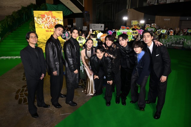本編上映に先立って行われた“グリーンカーペット”イベントには、豪華キャストと萩原監督が勢ぞろい。<防風鈴>を象徴するグリーンの階段に姿を現した瞬間、会場の熱気は一気に高まった。パフォーマーたちが旗を翻しながら先導すると、キャスト陣がゆっくりと階段を下りて登場──完成披露にふさわしい華やかさとスケール感に、観客は開始早々から大興奮!