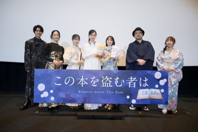 冒頭の挨拶で、本の街・読⻑町の巨⼤な書庫「御倉館」を管理する⼀家に⽣まれた本作の主⼈公、御倉深冬役の片岡は「足を運んでいただきありがとうございます」とニッコリ。深冬の前に突然現れた謎の犬耳少⼥、真⽩役の田牧は「お忙しい中お越しくださりありがとうございます。よろしくお願いいたします」と拍手に包まれた会場を見渡し笑顔を見せる。深冬の叔⺟、御倉ひるね役の東山は「12月26日から公開の本作をいち早く観ていただけるということで、とてもうれしいです。楽しんでいってください!」と上映前の観客に呼びかける。本好きな⾃称・⾵来坊の与謝野蛍⼦役の伊藤は「たくさんのみなさんに楽しんでいただけるのがうれしいです」と微笑み、読⻑商店街にある新刊書店「春⽥書店」で働く⼤学⽣、春⽥貴⽂役の土屋は「上映前のイベントということで、口を滑らさないように頑張ります!」と笑いを誘う。本作を⼿掛けた、福岡監督は着物にハットをあわせた衣装で、キャラクターデザイン&作画監督を務めた黒澤は、華やかな着物姿で元気に挨拶し、大きな拍手を浴びた。