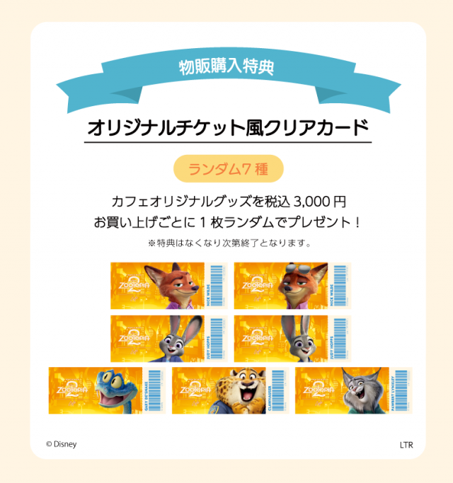 ■物販購入特典:カフェオリジナルグッズを 3,000 円(税込)以上お買い上げごとに、「オリジナルチケット風クリアカード(全 7 種)」をランダムで 1 枚プレゼント!※無くなり次第終了。