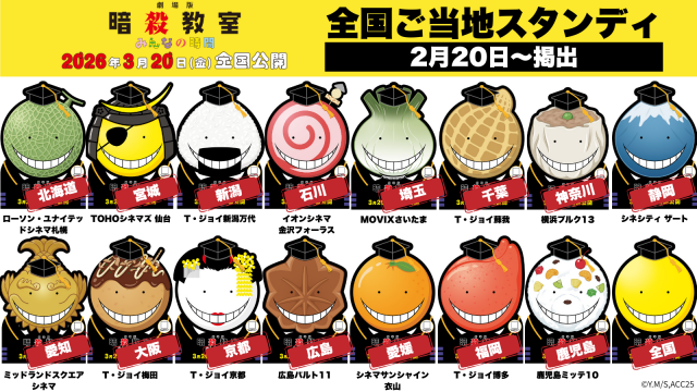 さらに、本作の公開を記念して全国の劇場で「ご当地殺せんせー」企画も始動。『劇場版「暗殺教室」みんなの時間』公開劇場(※一部劇場を除く)にノーマルの殺せんせースタンディが掲出される他、石川県の「おでん」や、神奈川県の「シュウマイ」、鹿児島県の「白くま」など、各地の特産品に扮したファン必見の限定スタンディが全国15劇場に出現。スタンディに印字されたQRコードからは、その劇場でしか手に入らないスタンディと同じデザインの「ご当地殺せんせースマホ壁紙」も入手可能。スクリーンで描かれる完全新規エピソードと共に、劇場という「暗殺教室」で、自分たちの街の殺せんせーをぜひ捕まえてほしい。