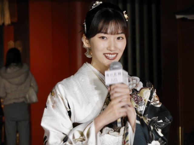 片岡凛さんは「花梨は金のイヤリングだったりゴールドを付けることが多かったので、妖狐の赤と白、ゴールドを付けていただきました。髪飾りも帯も本当に素敵で。」と話し、優雅に一回転。