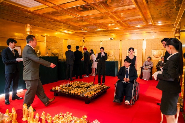 この度、公開直前を記念し公開直前を記念し、ゴージャスで、煌びやかな新規場面写真6点を解禁!こうしたスチール写真から、ゴールドの輝きに目を奪われます。それもそのはず、本編に登場する金(きん)、並びに金(きん)工芸品の数々は全て【本物】、総額については数百億円と言われています。おそらく、日本映画の歴史においても、ここまで【本物の金(きん)】が撮影用に用意され、実際に登場した作品もないのではないか・・・そんな【本物志向】もまた、本作の見どころのひとつと言えます。ちなみに、本編の撮影当時の金(きん)1g が17,000 円だったのに対して、現在は 28,000 円台になるなど、金(きん)の価値自体が、映画の公開に向け、どんどん高騰しています!