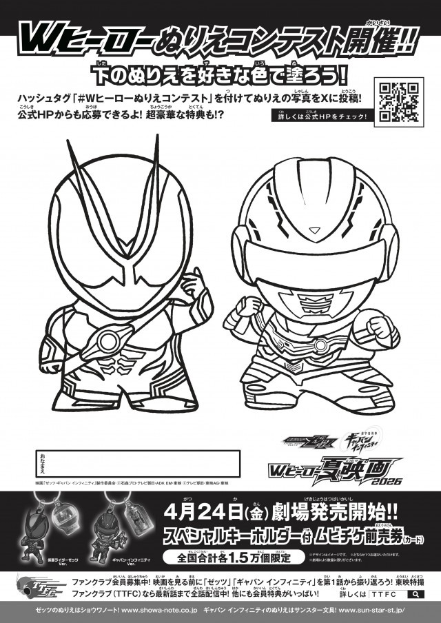 昨年に引き続き、「W ヒーローぬりえコンテスト」を開催します!「ぬりえチラシ」の<仮面ライダーゼッツ><ギャバン・インフィニティ>のイラストを自由にぬってご応募いただき、選ばれると超豪華特典がもらえるキャンペーンになります。毎度人気を博している映画のエンドロールにぬりえが載るプレミア特典が今年もございます!